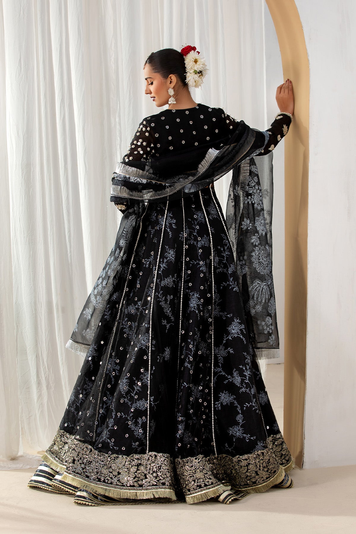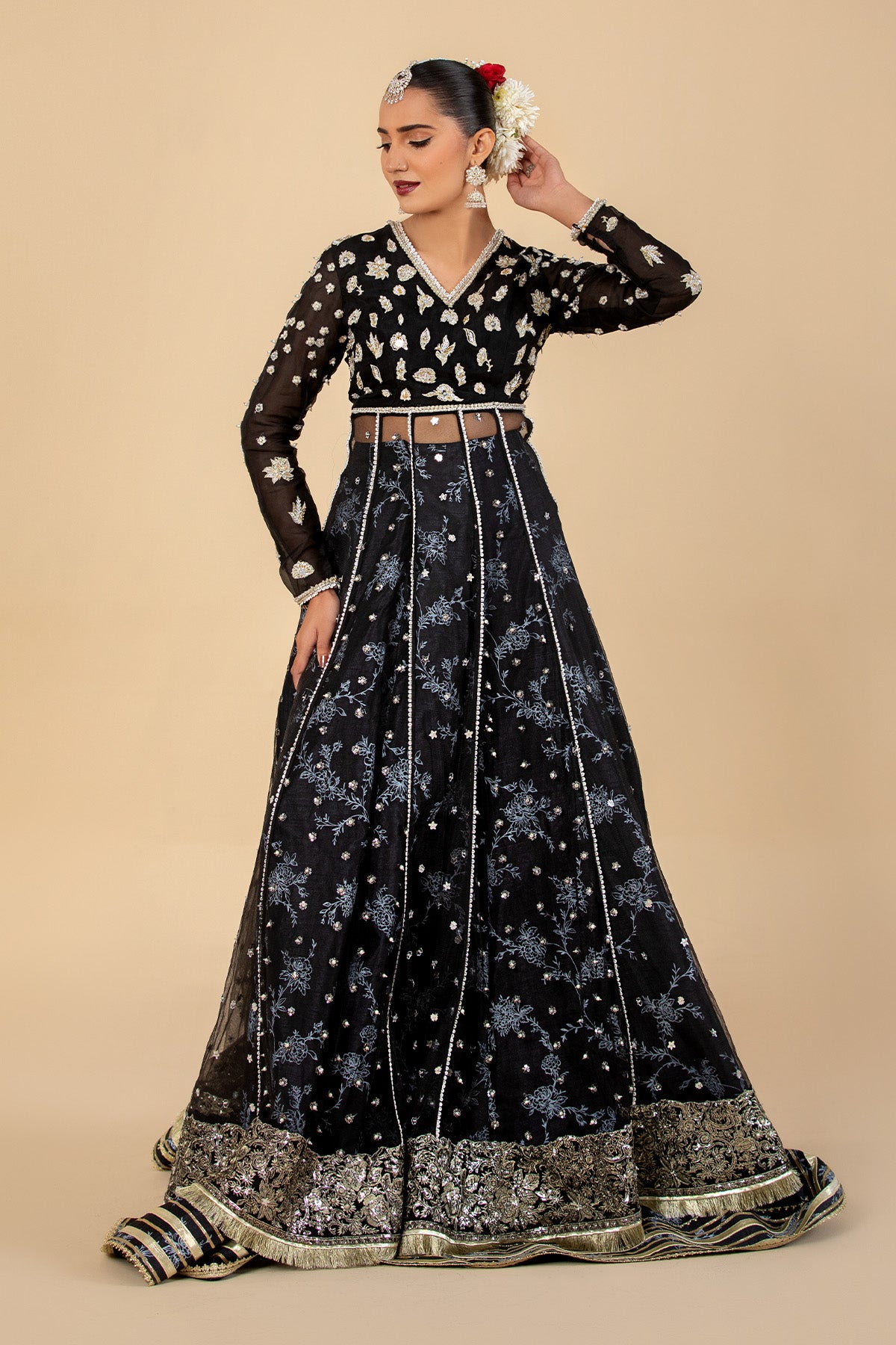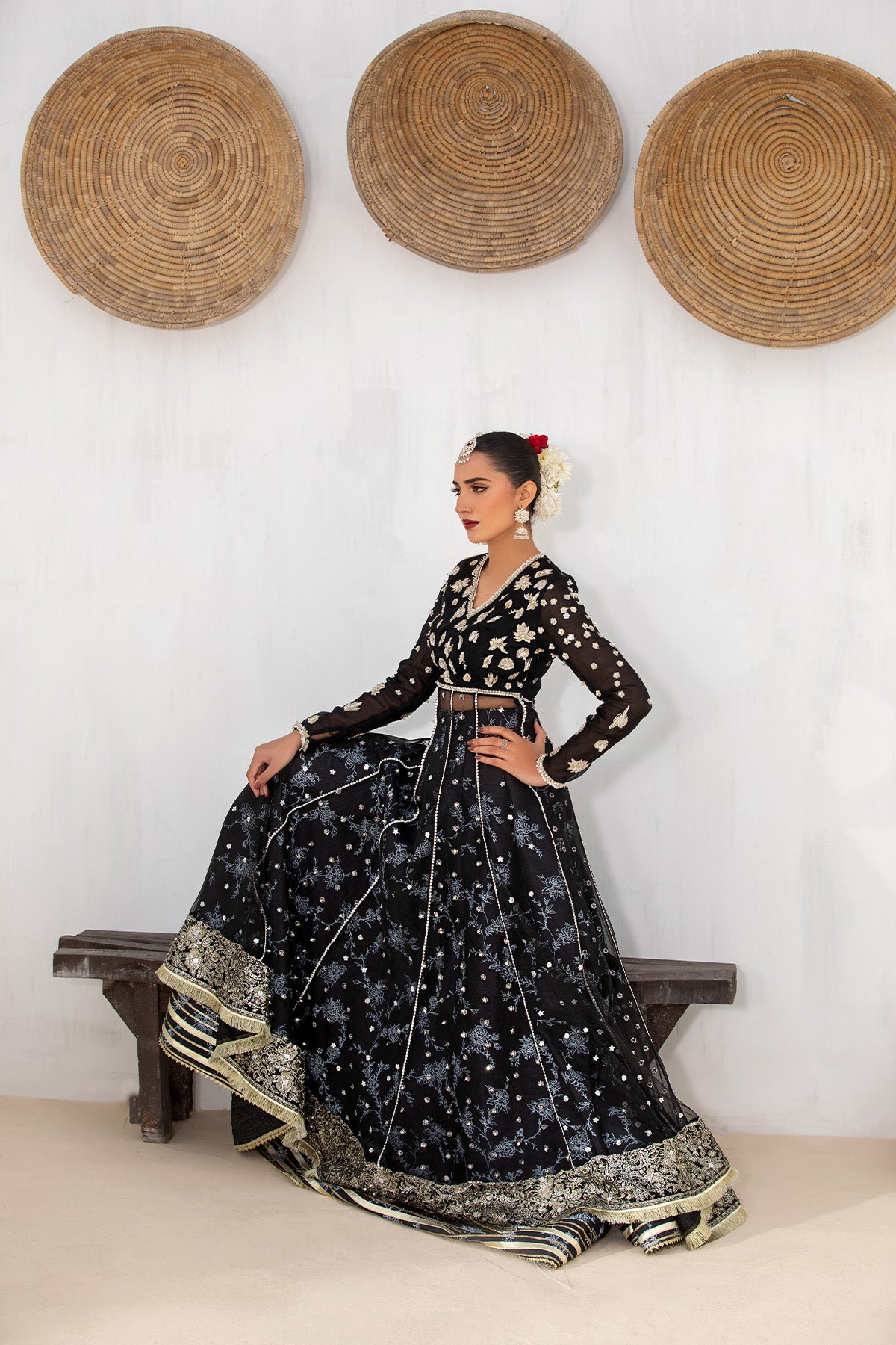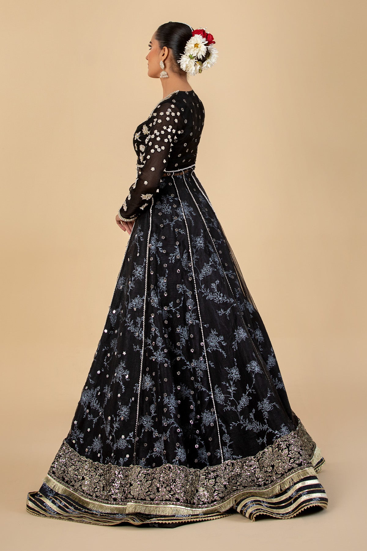 A timeless black pishwas adorned with intricate handwork on the bodice and panels, paired with a classic screen-printed lehenga. The look is elevated with a heavily screen-printed dupatta.