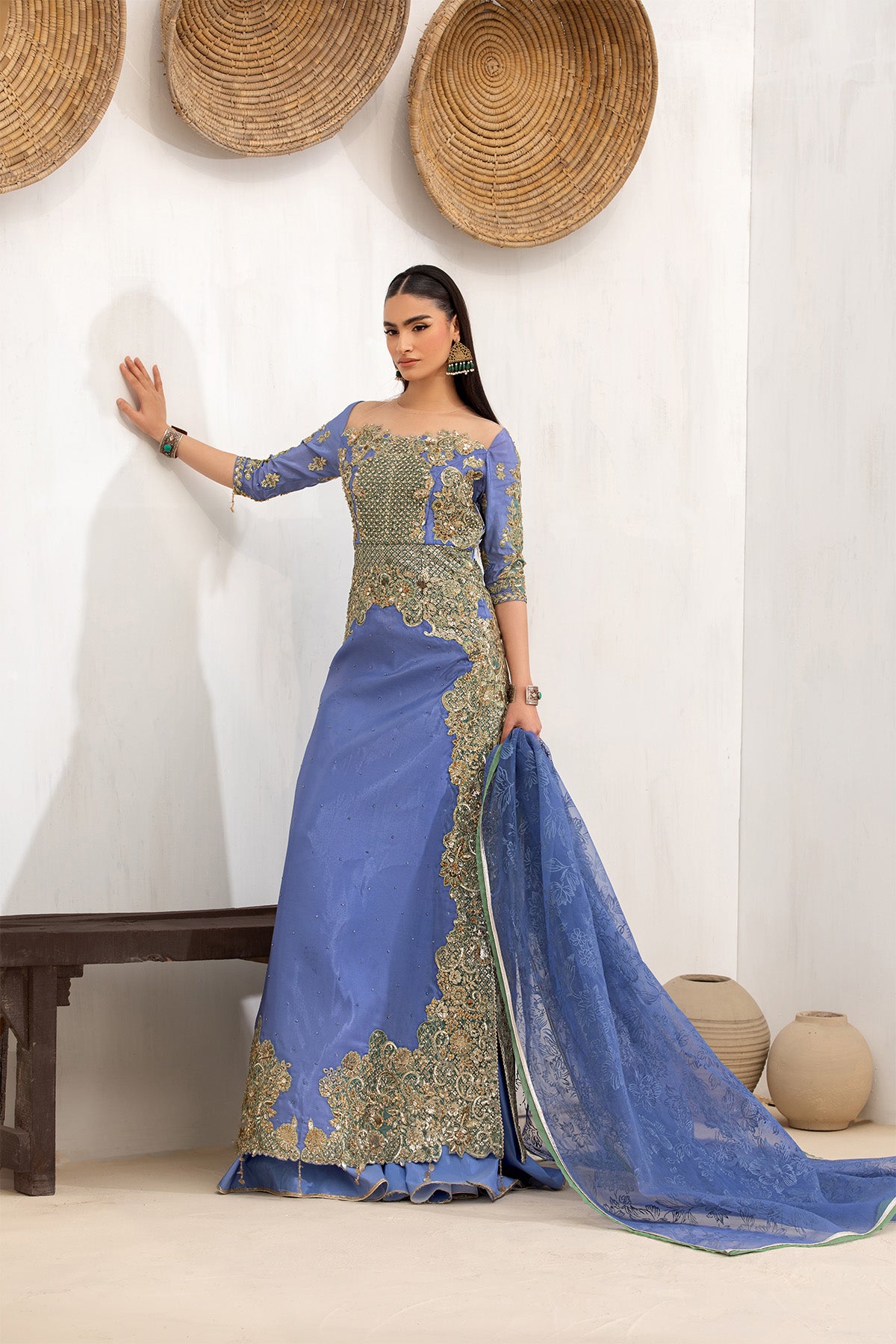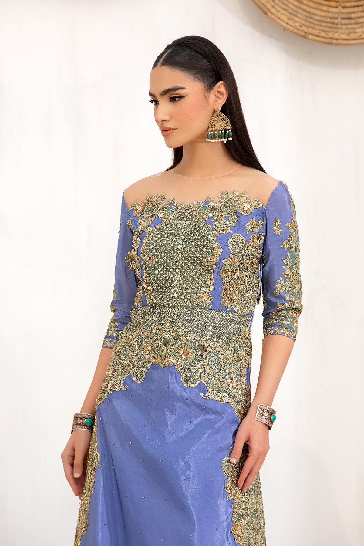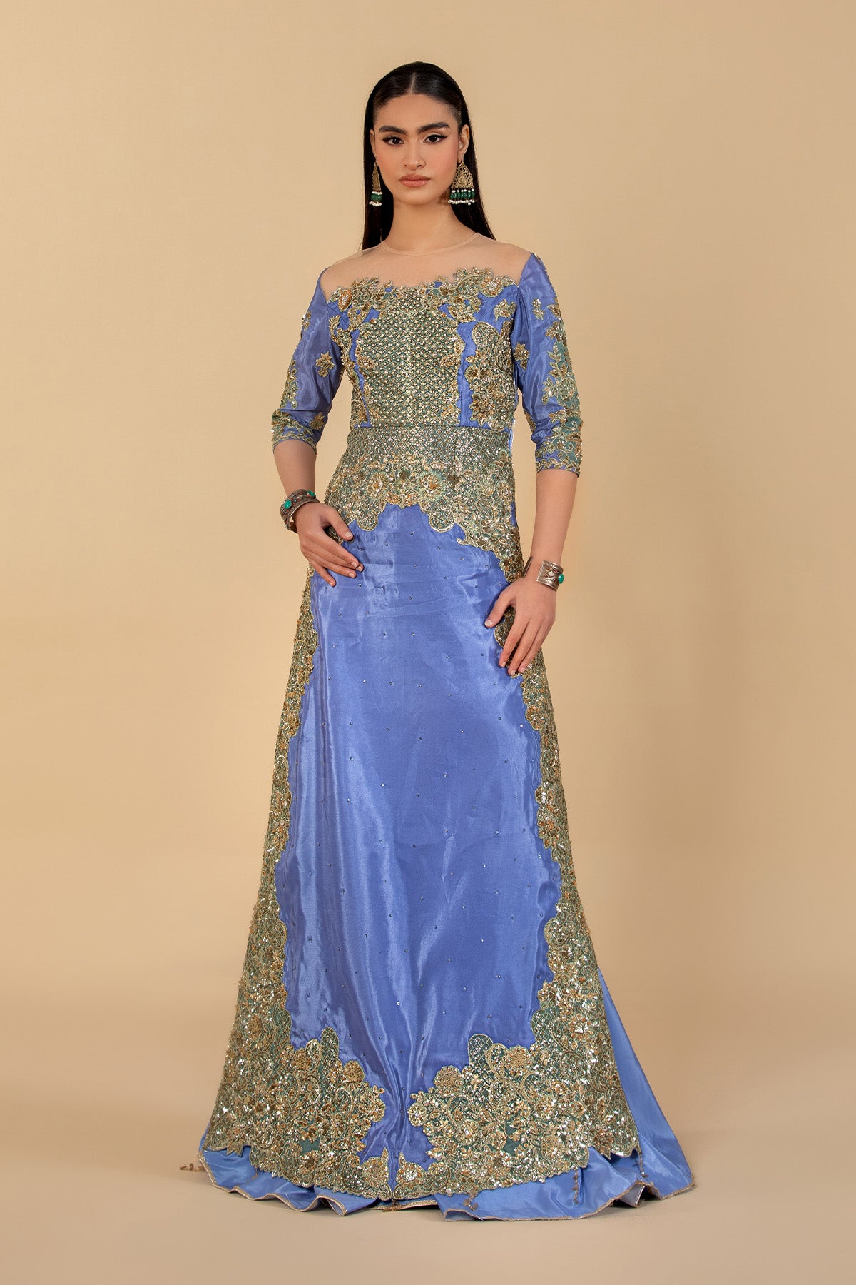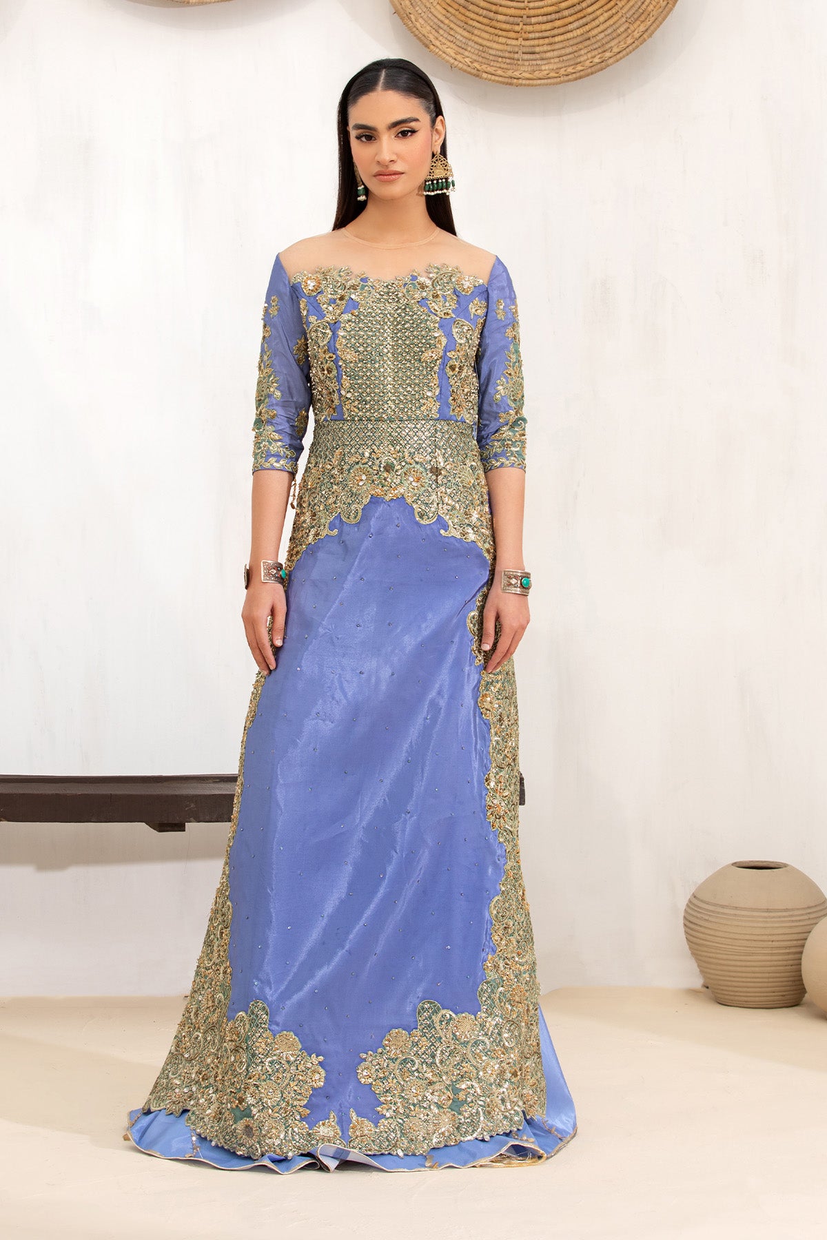 This stunning three-piece outfit features a silk-based ensemble, beautifully embellished with precious sequins and stones, paired with a classic gharara for an effortlessly elegant look.