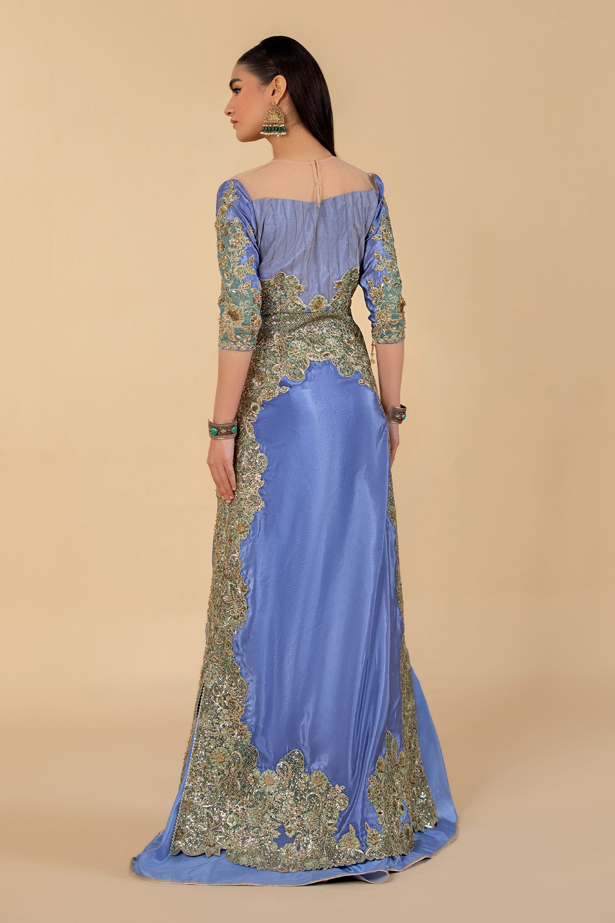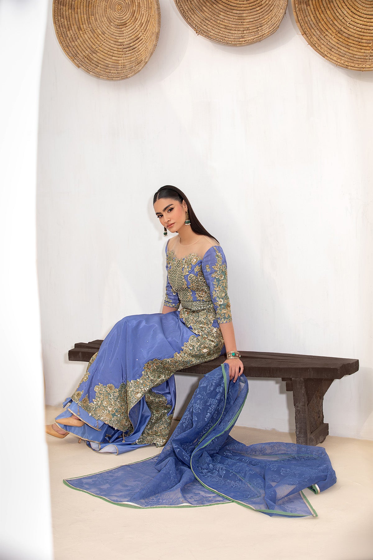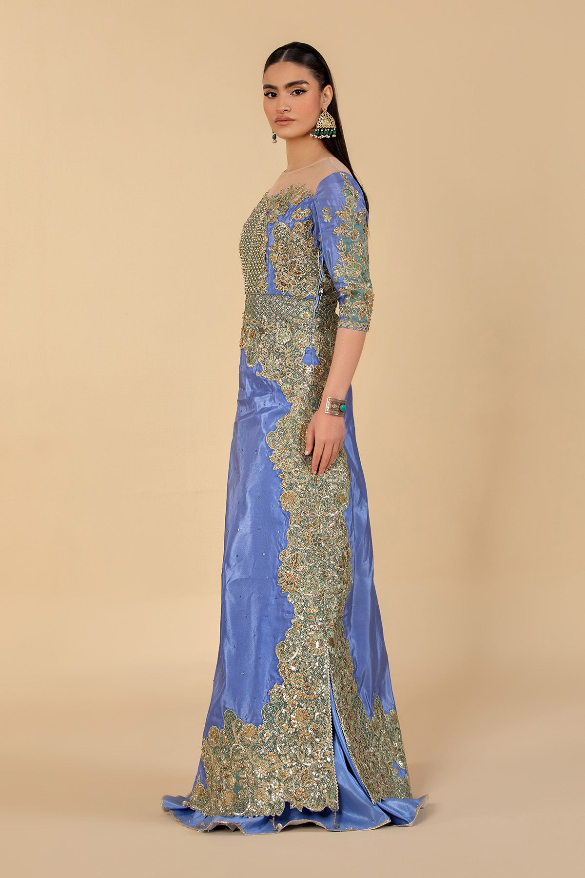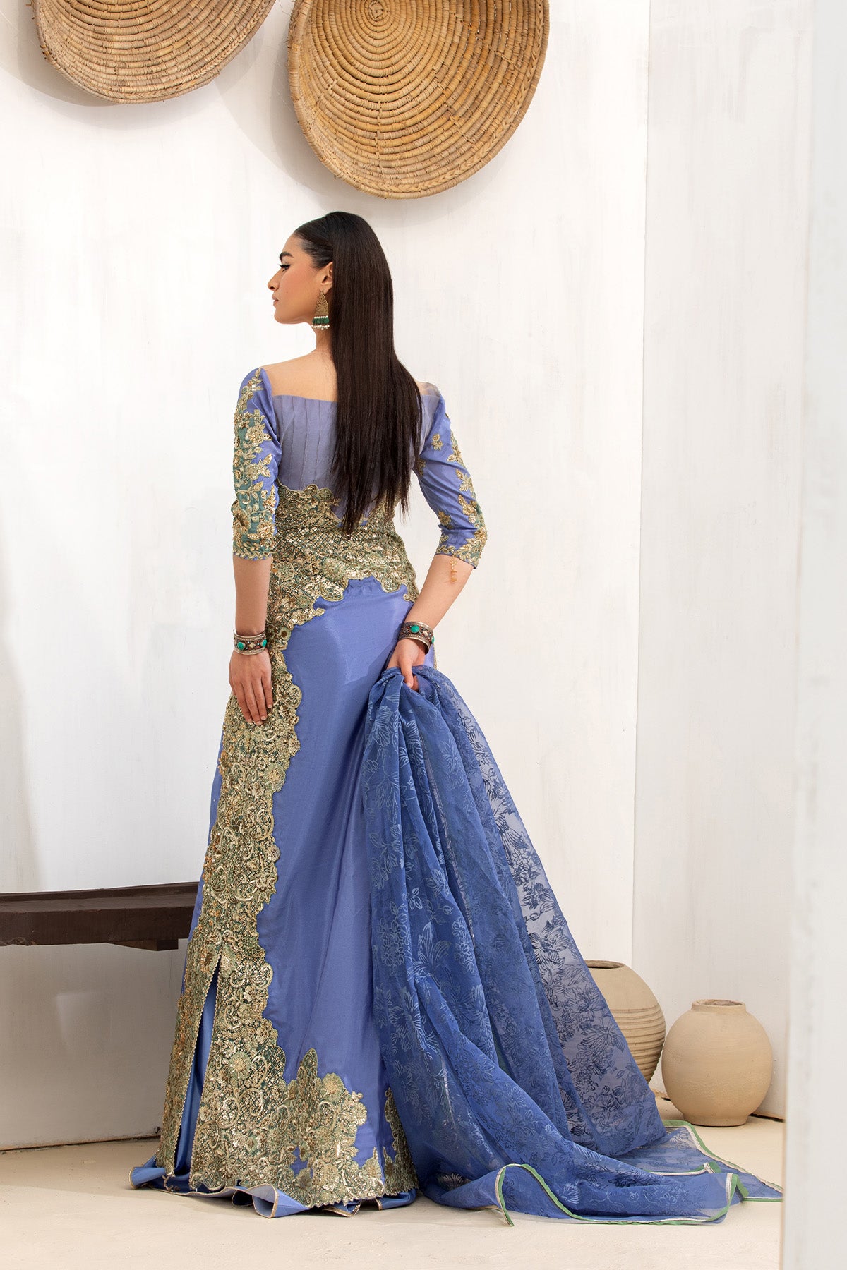 This stunning three-piece outfit features a silk-based ensemble, beautifully embellished with precious sequins and stones, paired with a classic gharara for an effortlessly elegant look.