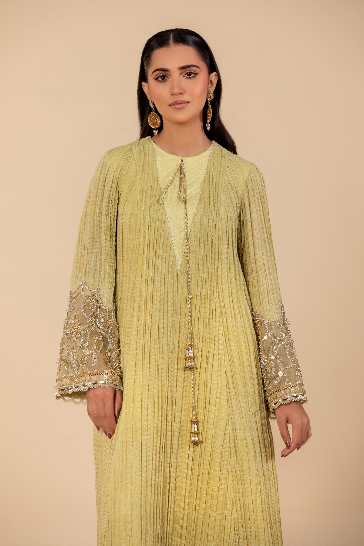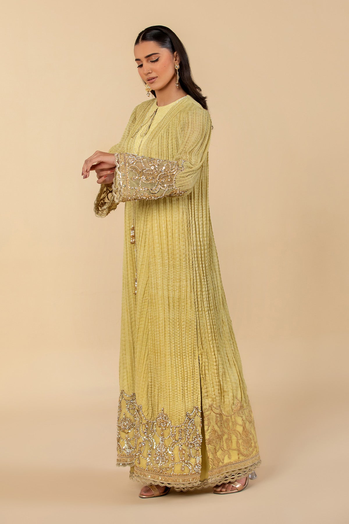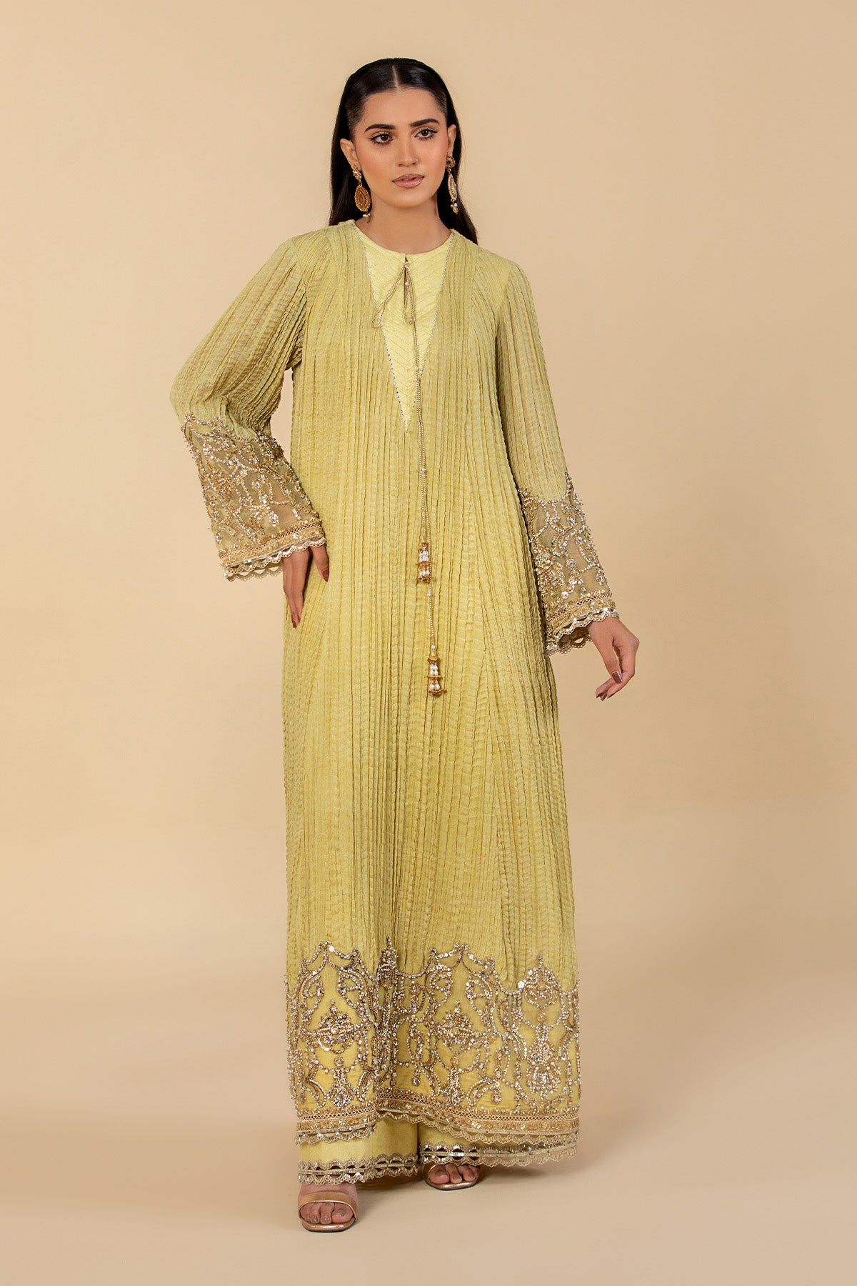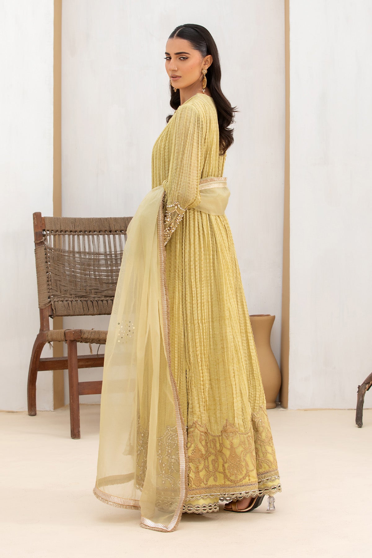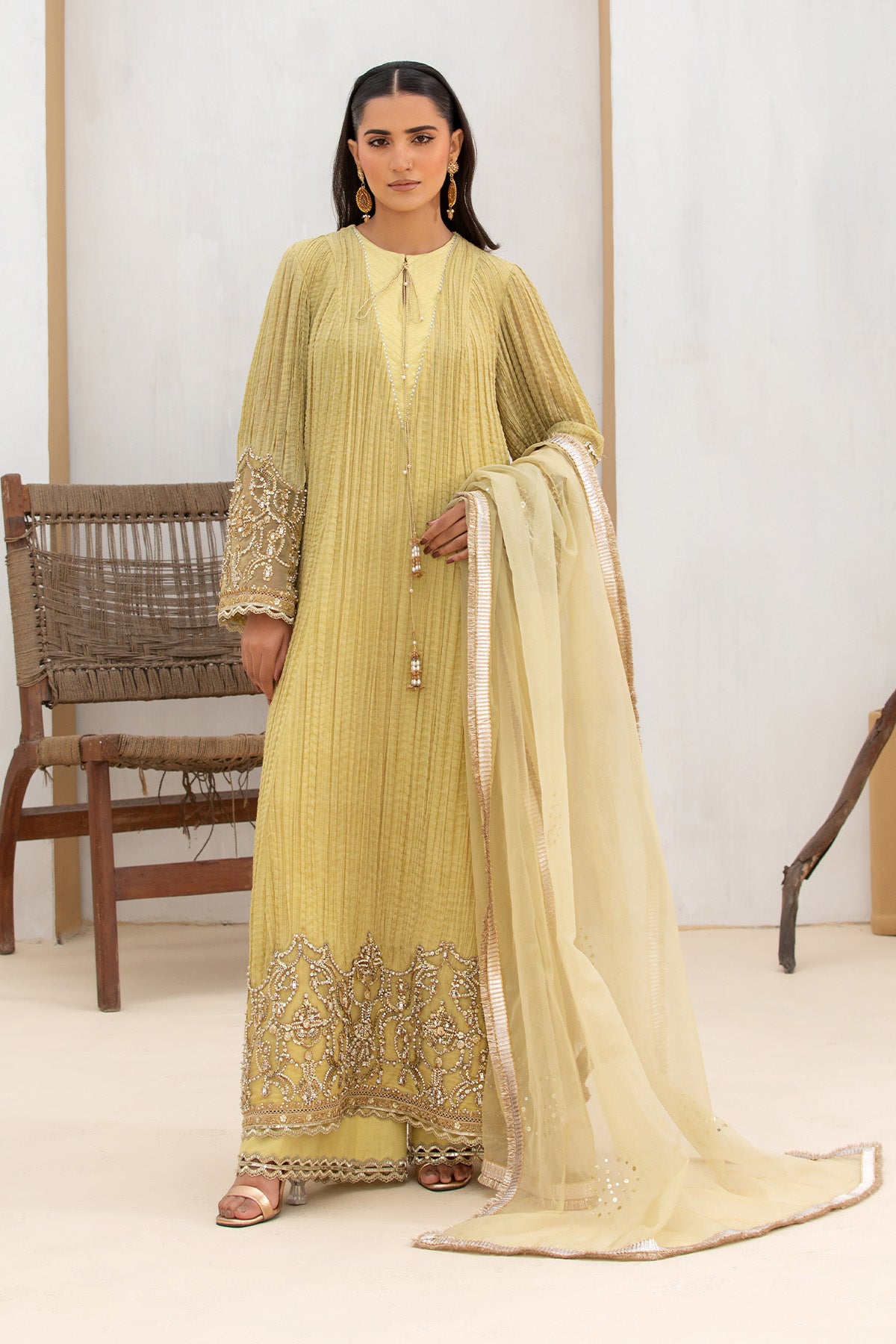 An exquisite three-piece ensemble in a stunning cosmic golden hue. This beautifully crafted crushed chiffon pishwas is adorned with intricate embroidery and decorative splatter detailing. Its quilted neckline is accentuated by delicate tassels. This outfit is completed with an organza dupatta.