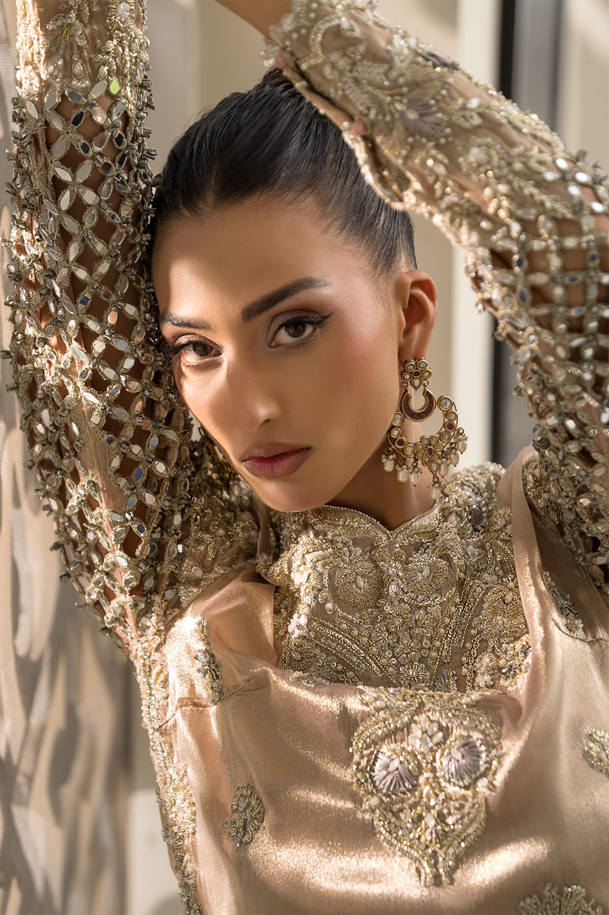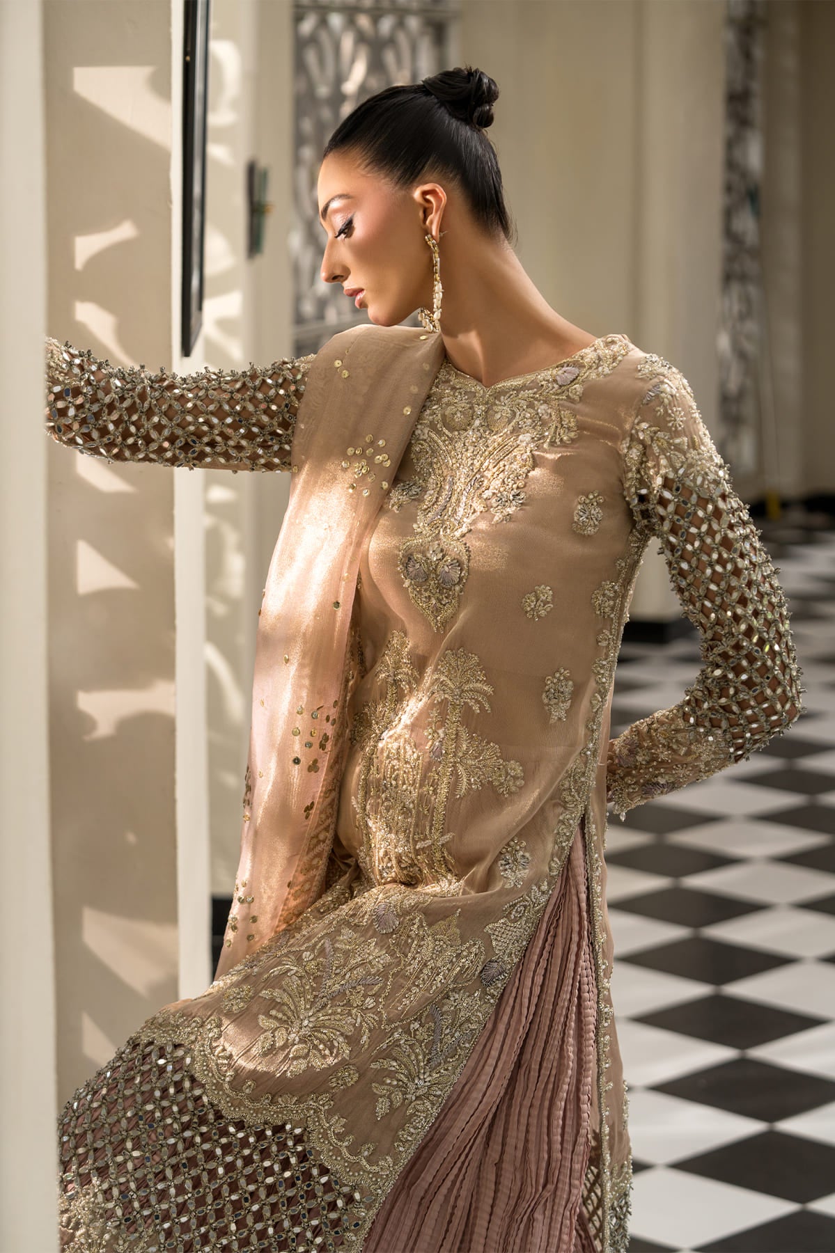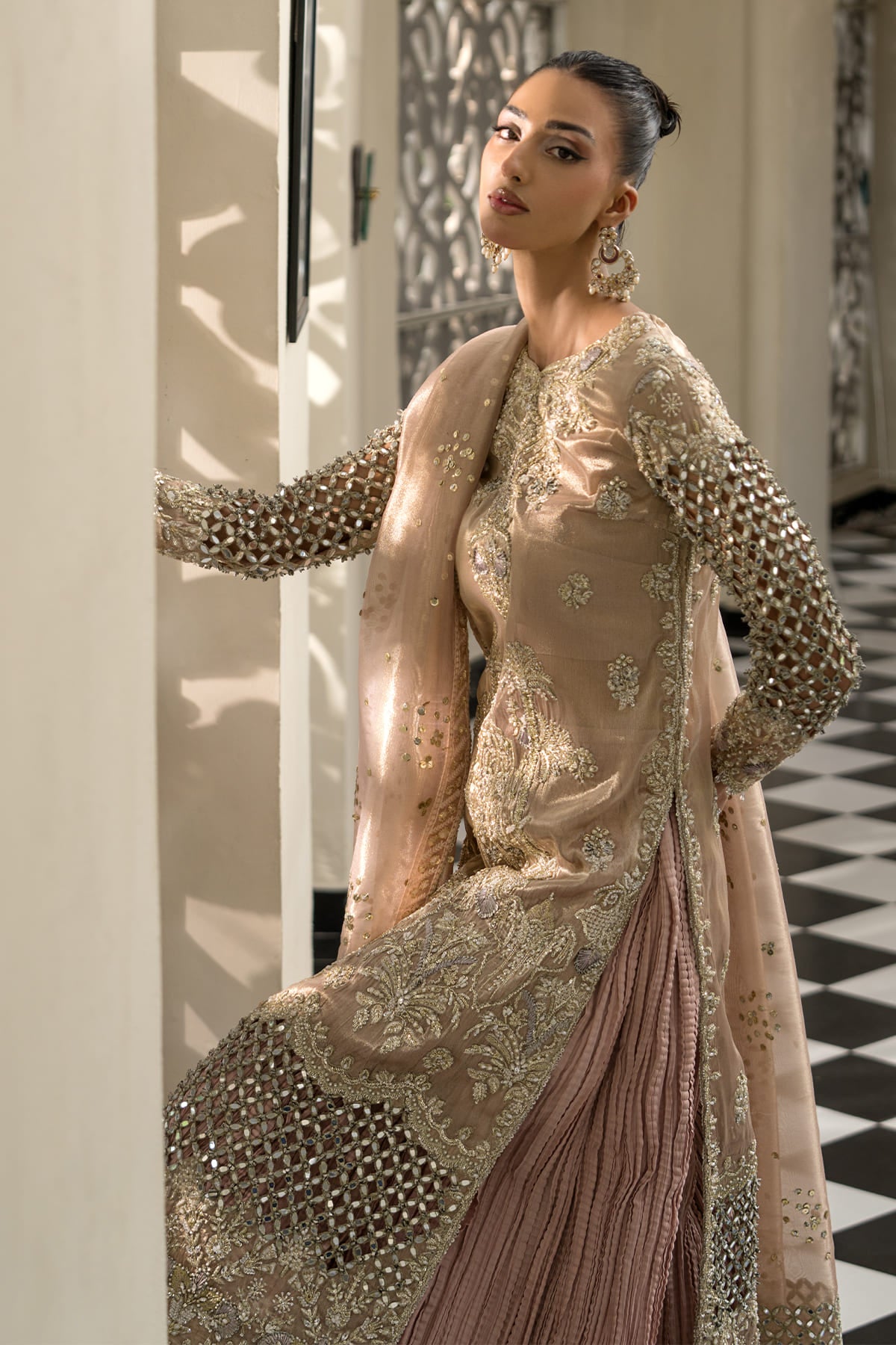 A gorgeous rose gold dress on Chanderi tissue. It’s adorned with stunning hand embellishments with intricate Zardozi, crystals, and delicate sheesha cut work. With pure silk crushed sharara that adds a touch of elegance, it’s the epitome of timeless beauty.