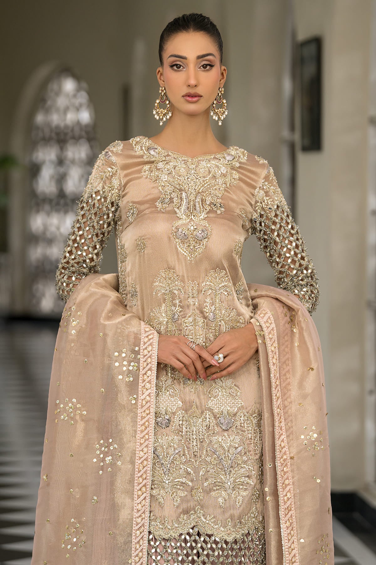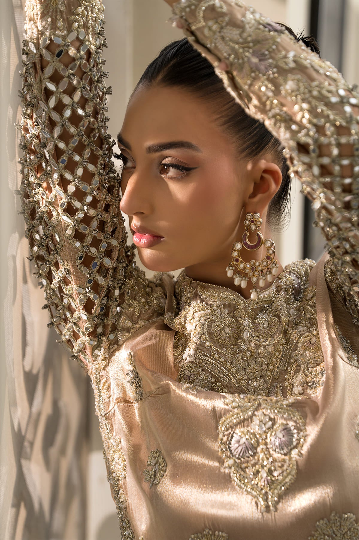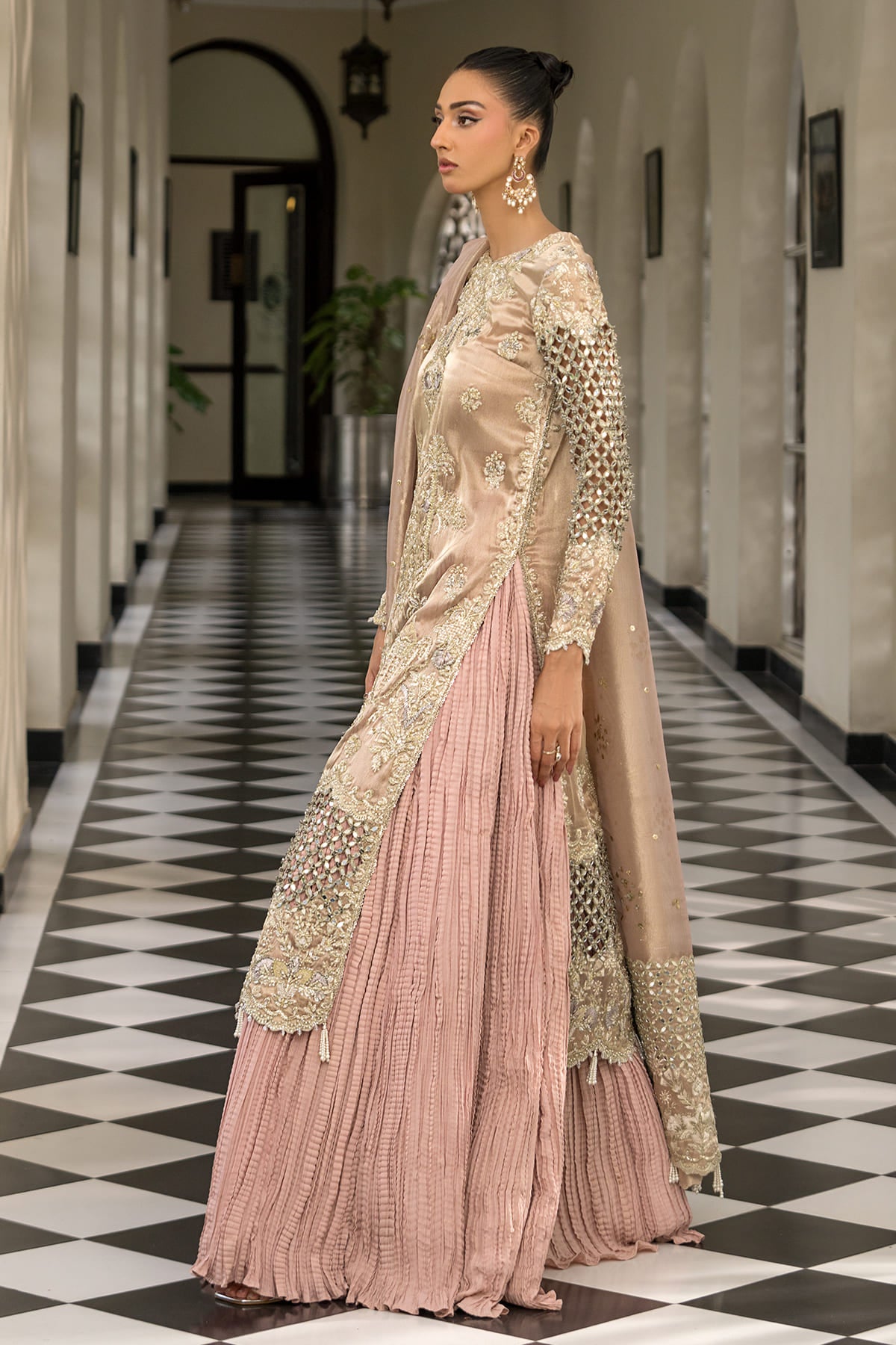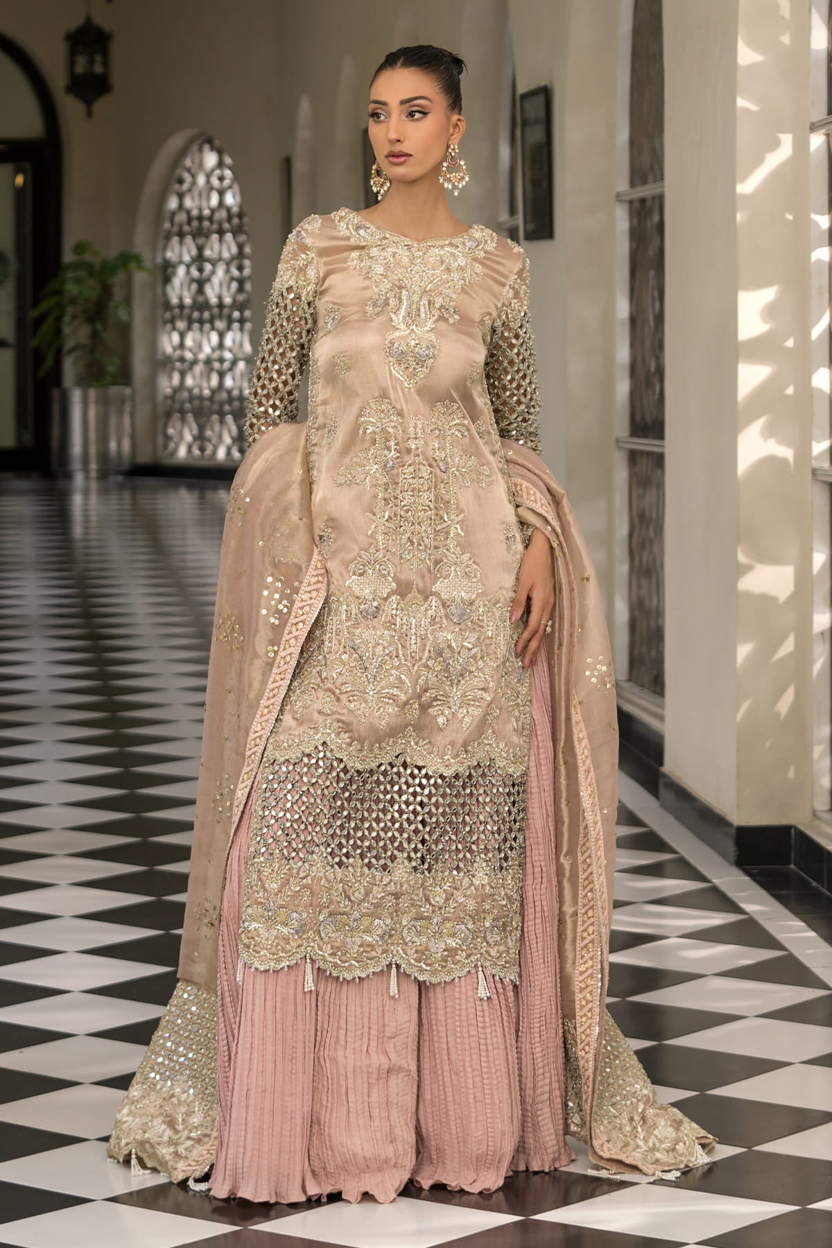 A gorgeous rose gold dress on Chanderi tissue. It’s adorned with stunning hand embellishments with intricate Zardozi, crystals, and delicate sheesha cut work. With pure silk crushed sharara that adds a touch of elegance, it’s the epitome of timeless beauty.