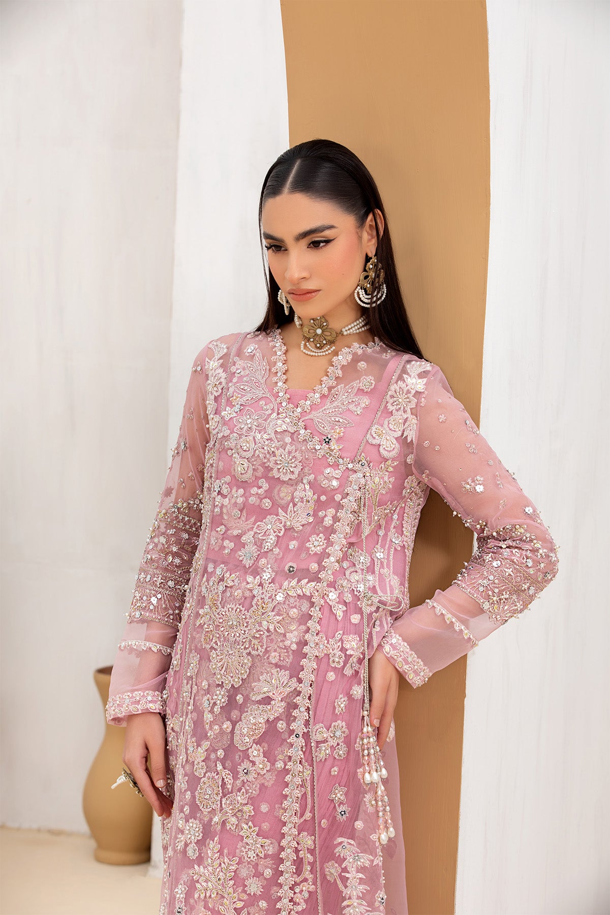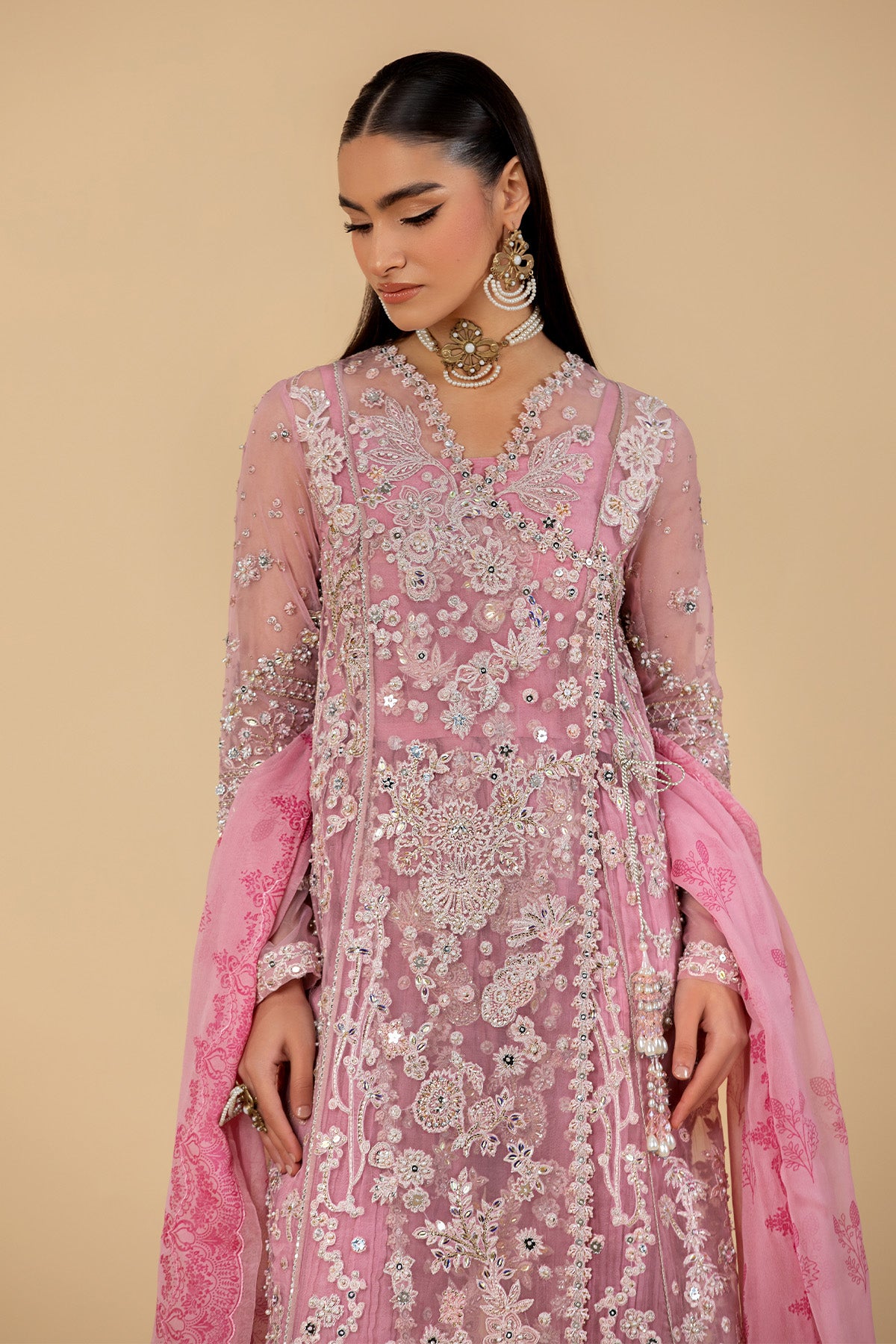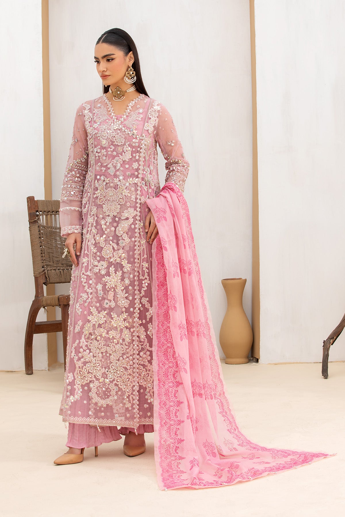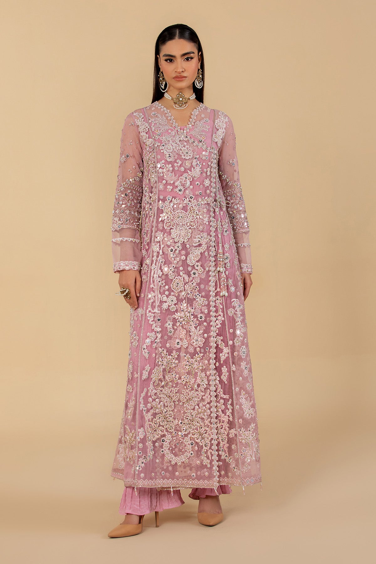 A dreamy lilac pink angrakha adorned with exquisite miniature embroidery in vibrant hues, enriched with delicate handwork that speaks of true craftsmanship. Paired with a beautifully printed dupatta and classic crushed pants for a graceful finish.
