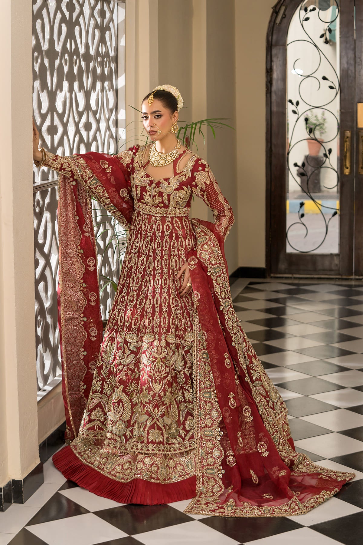 Zohra — the hue of dawn and the flame of Mahroon, wraps around the bride like whispered tales unsaid. Embroidery dances with threads of time, a weave of history, rich and sublime. French floral chintz, a whisper of the past, fused with traditions that forever last.